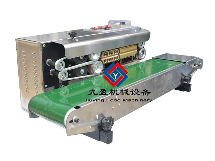 3、當裝有物品的包裝放置在輸送帶上,袋的封口部份被自動送入運轉(zhuǎn)中的兩根封口帶并帶入加熱區(qū),加熱塊的熱量通過封口帶傳輸?shù)酱姆饪诓糠荩贡∧な軣崛圮洠偻ㄟ^冷卻區(qū),使薄膜表面溫度適當下降,然后經(jīng)過滾花輪(或印字輪)滾壓,使封口部份上下塑料薄膜粘合并壓制出網(wǎng)狀花紋(或印制標志),再由導向橡膠帶與輸送帶將封好的包裝袋送出機外,完成封口作業(yè)